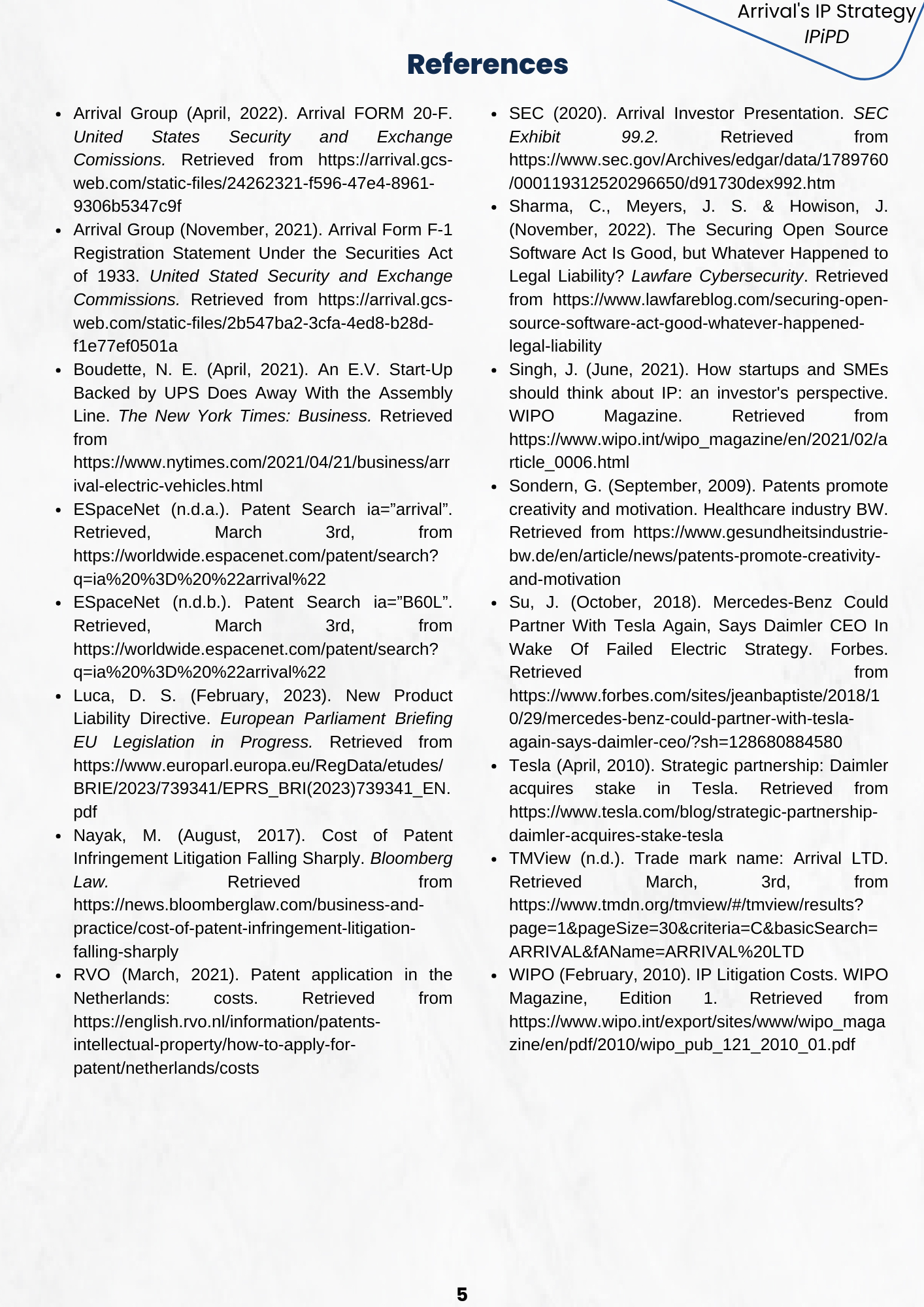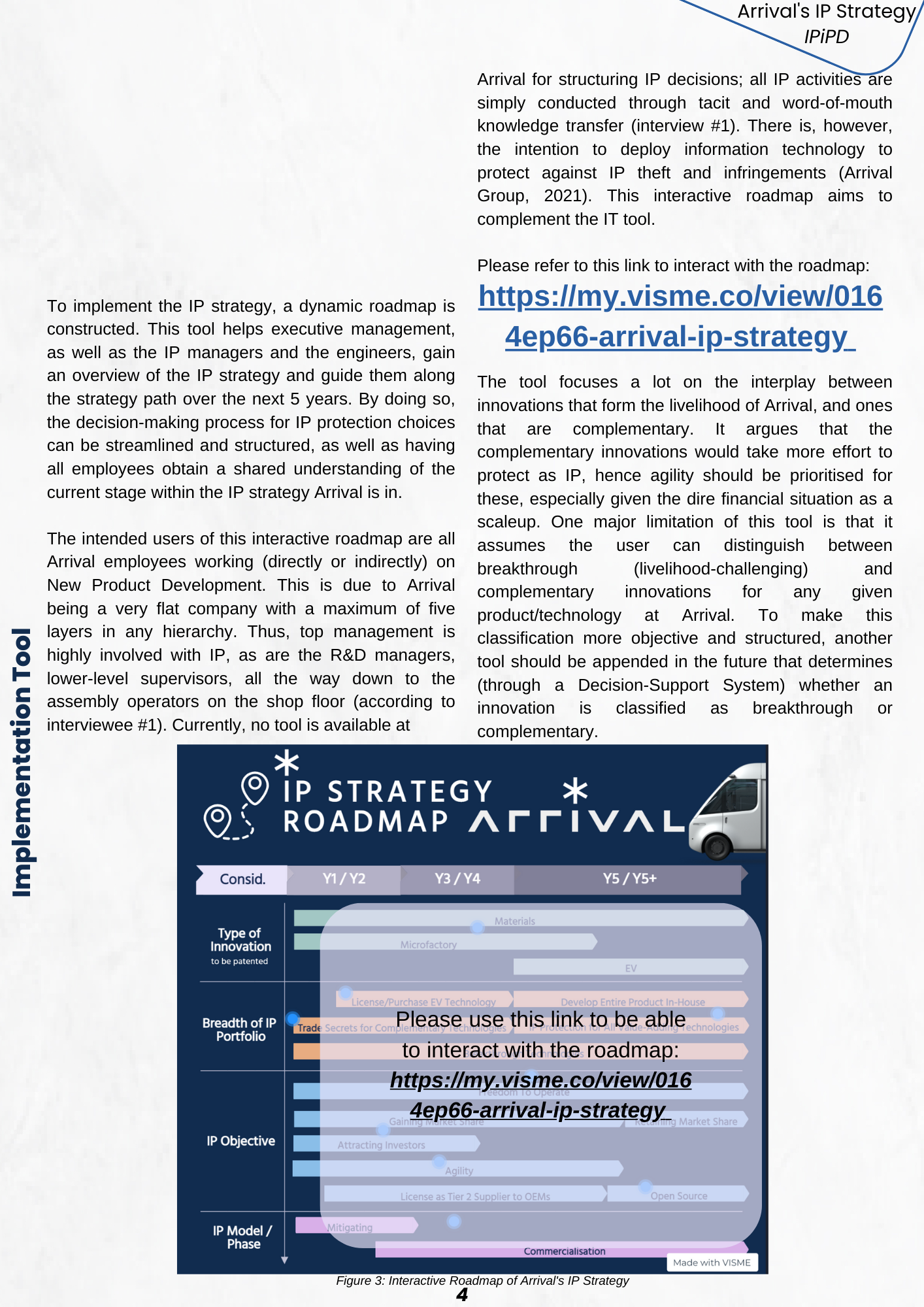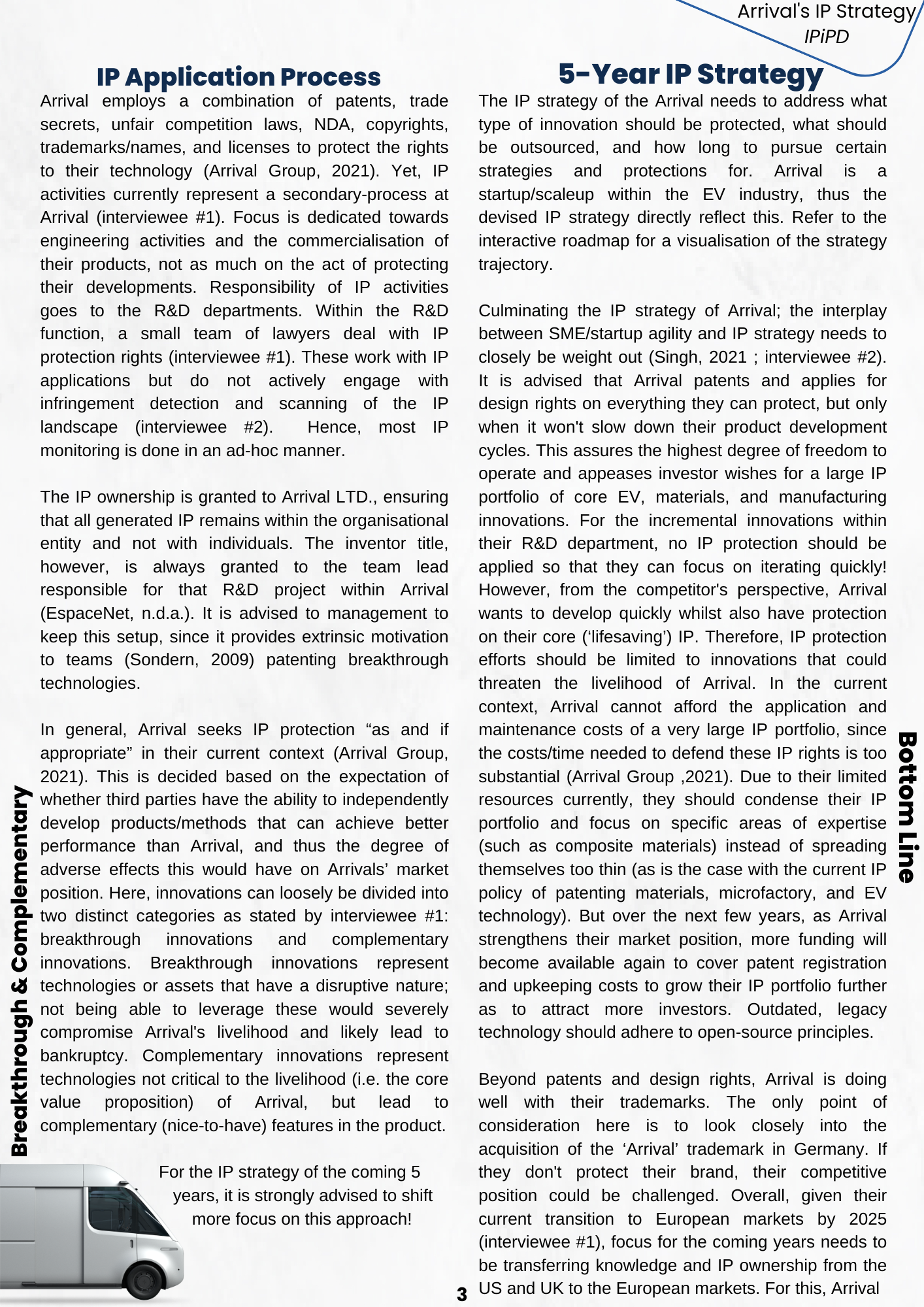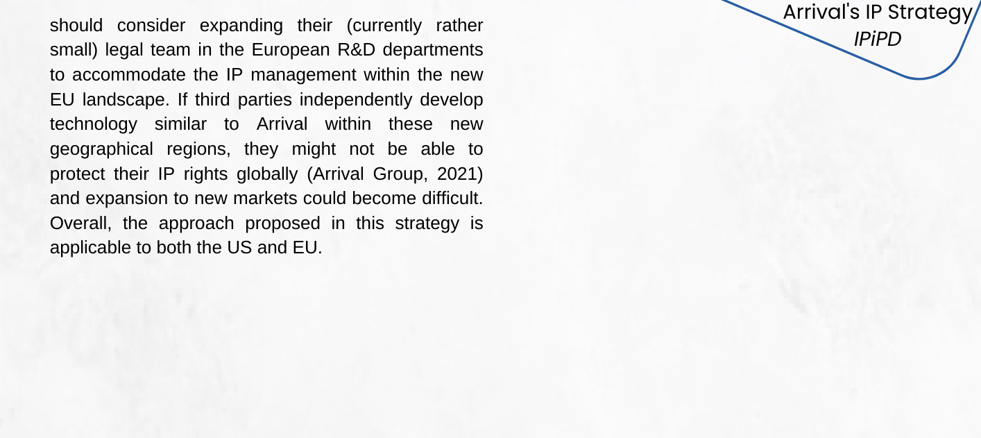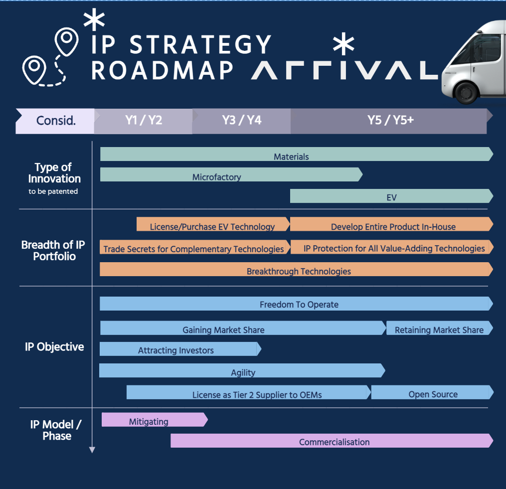 In order to properly manage the R&D developments of the product portfolio of a company, an Intellectual Property Strategy was fathomed for an EV manufacturer. This strategy aims at retaining, protecting, and leveraging the various IP that is sourced from the EV product development, Arrival's innovative matrix-based production approach, and their cutting edge material innovations.