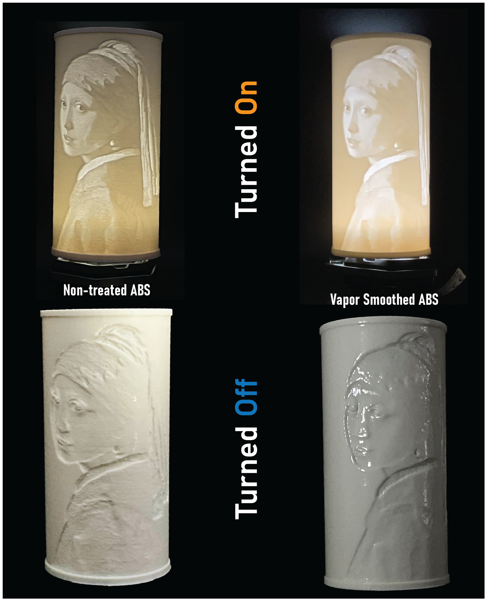Additionally, previously in fall-impact product tests, the PLA shades would break along the printing line. Instead, by fusing the layers together on the outer wall and using ABS with higher toughness than PLA, the print's material properties become more isotropic and thus stronger. Thus, with the vapor smoothed ABS print, resistance against impacts or falls is increased significantly; making for a more durable product.