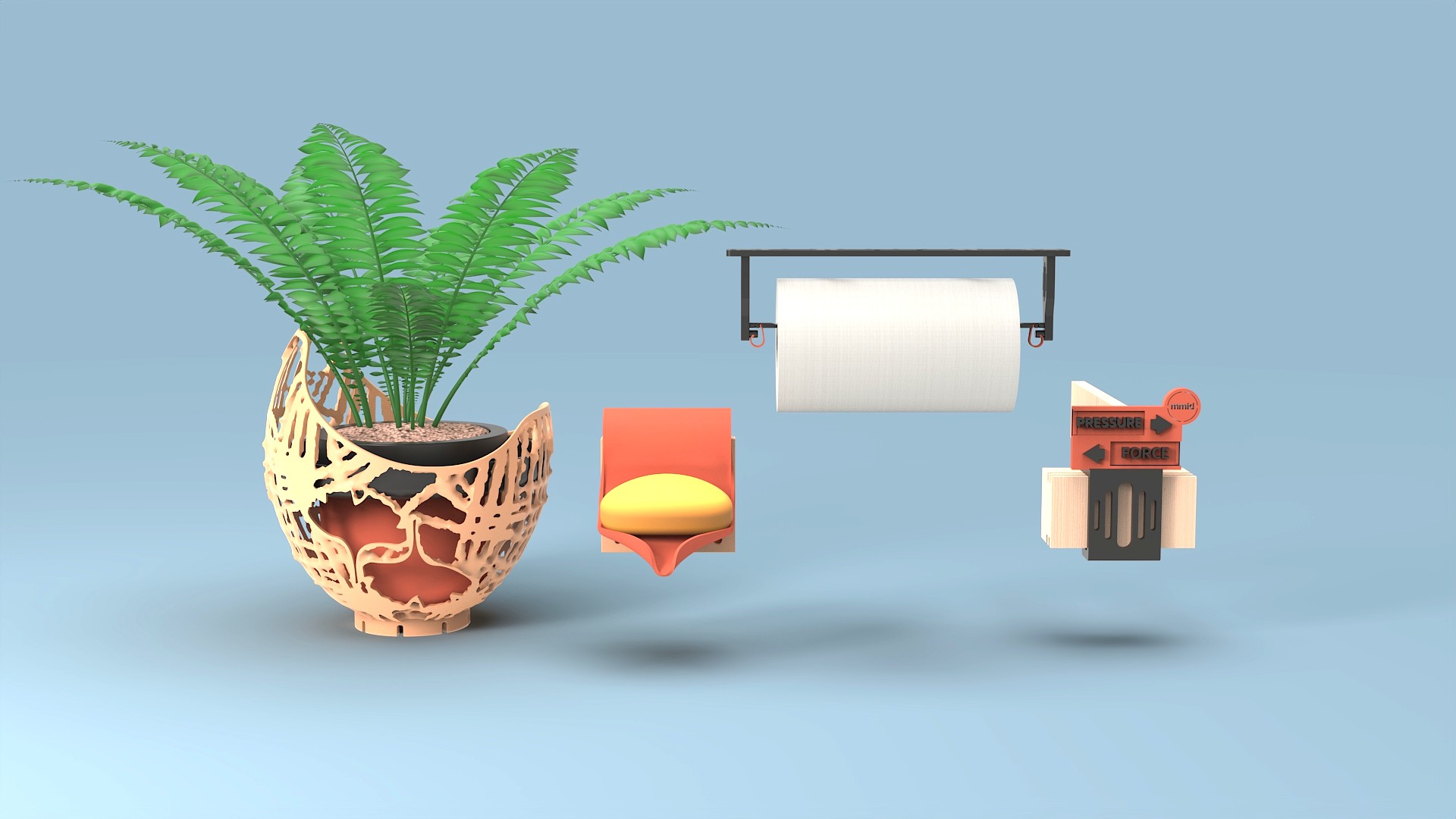 Although additive manufacturing remains the most suitable process for realizing these complex forms, each product was engineered with production scalability in mind by using modular part divisions, simplified orientations, and material-efficient geometries that could transition to hybrid manufacturing methods if need be.