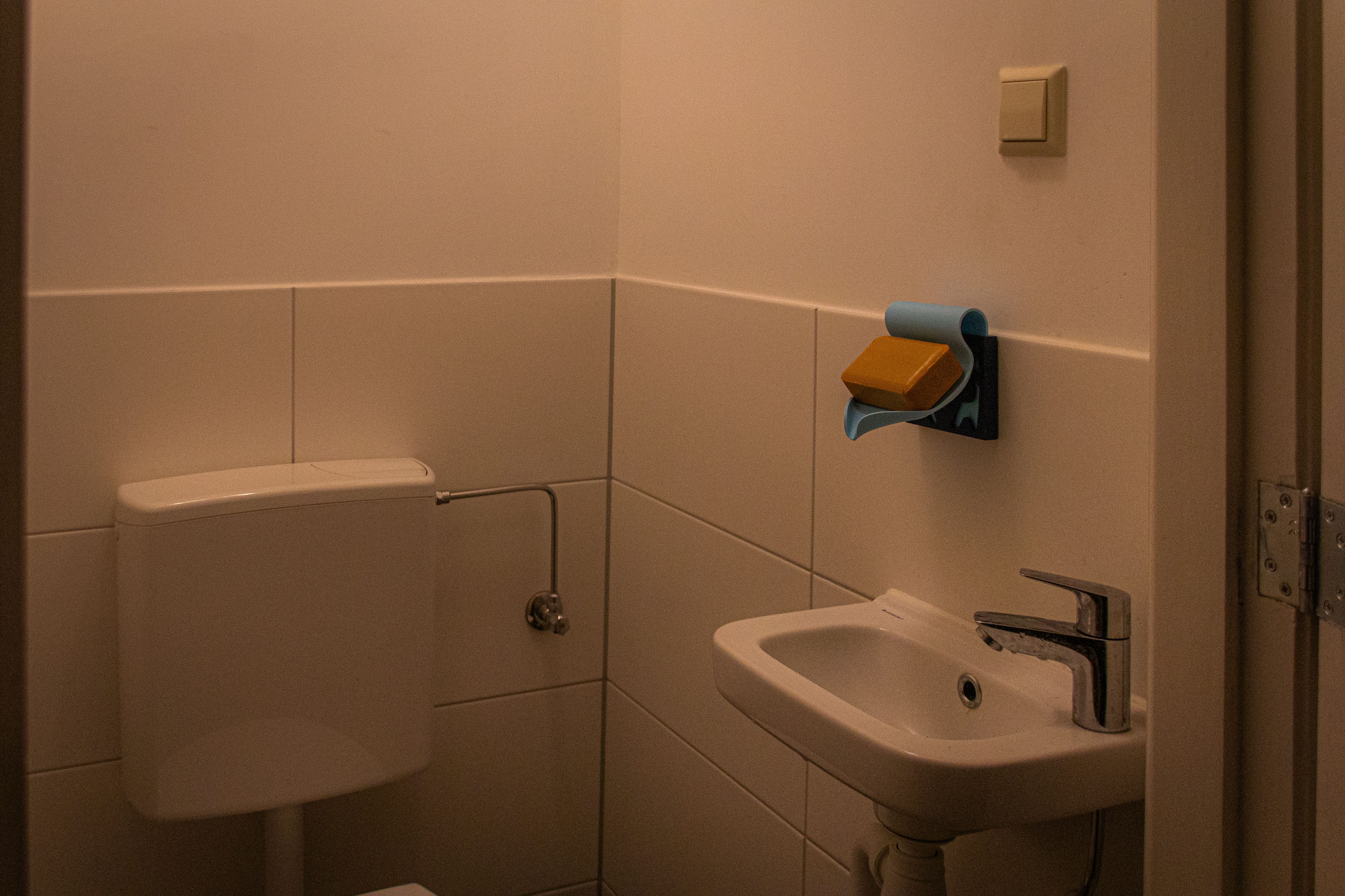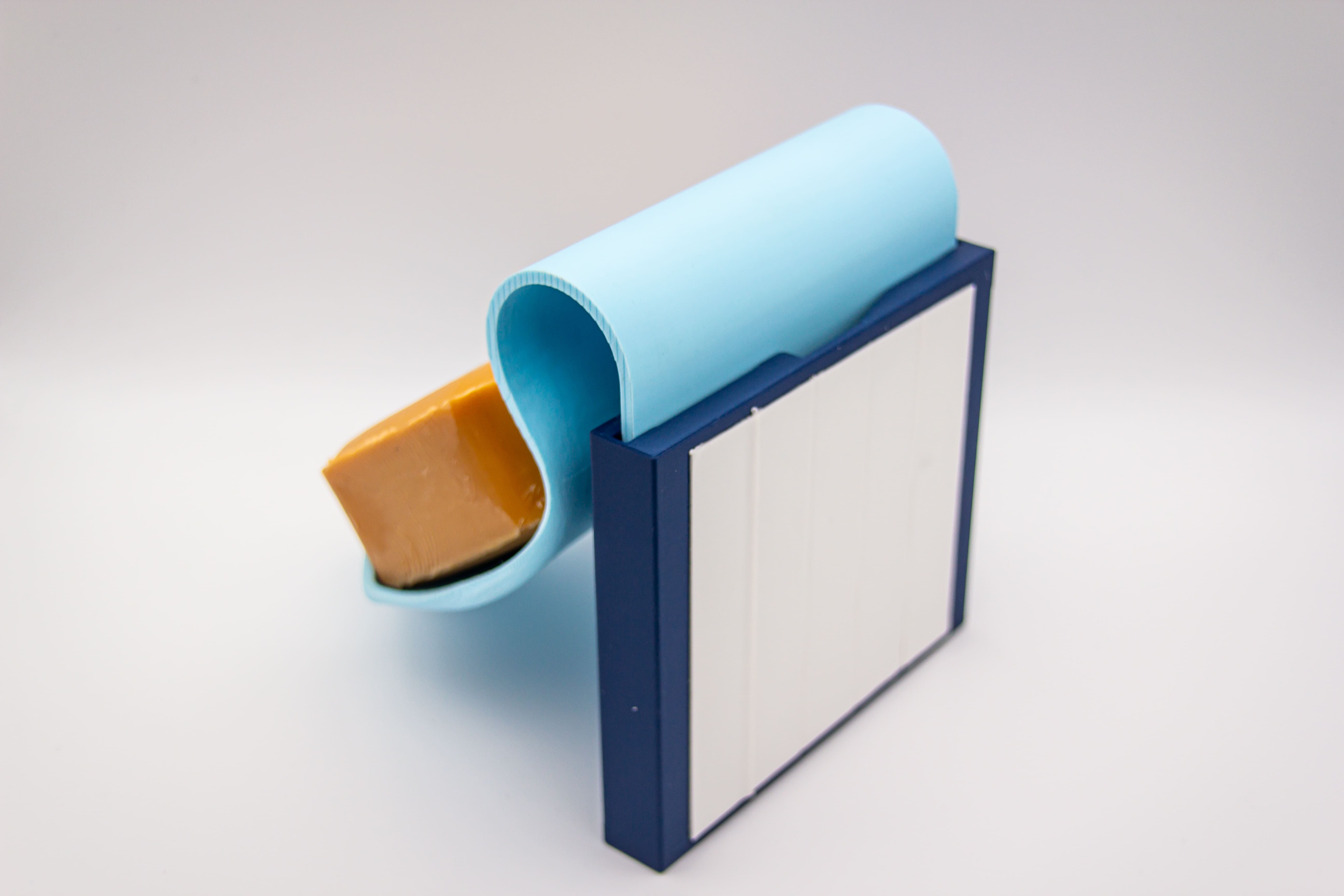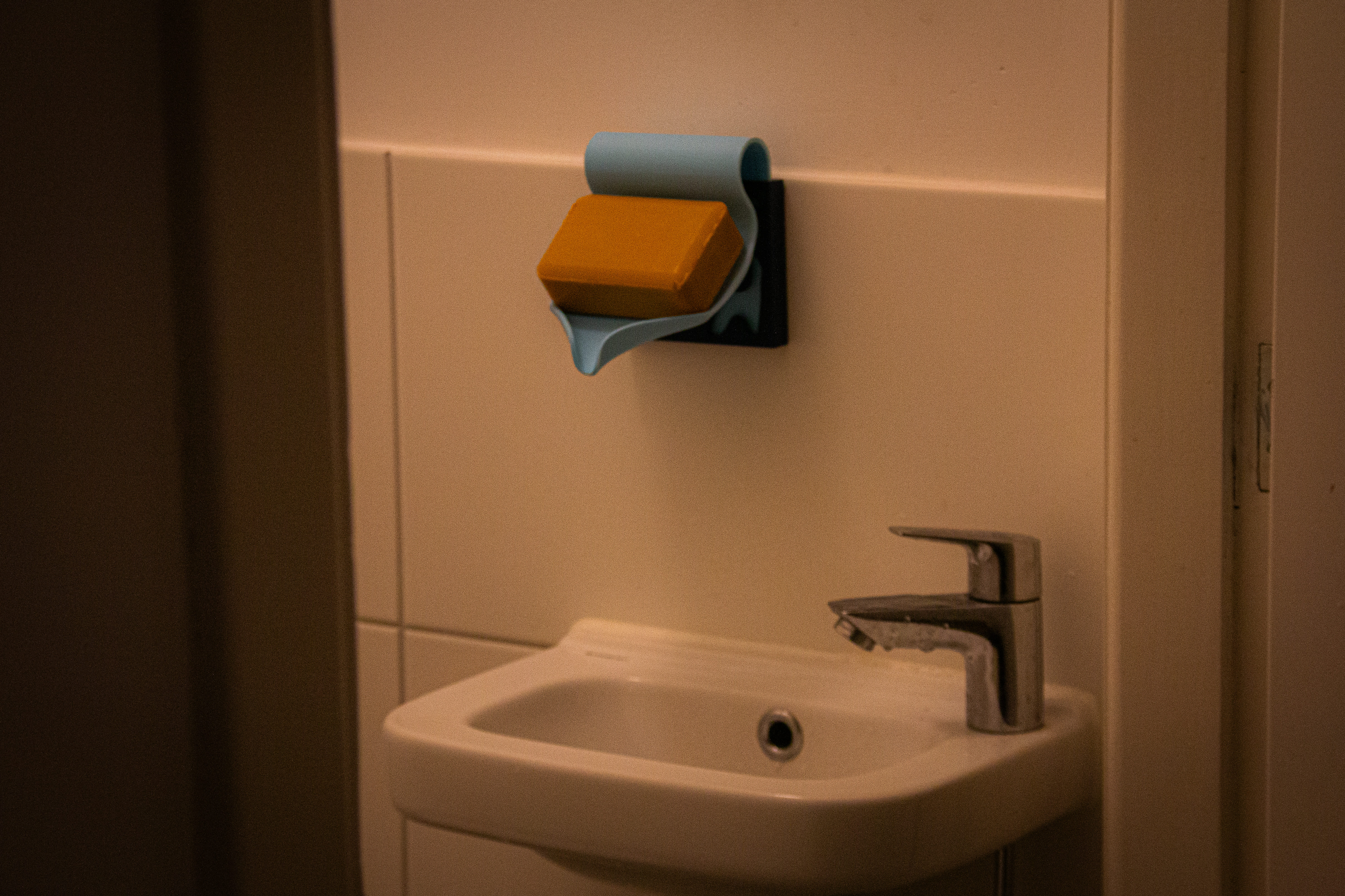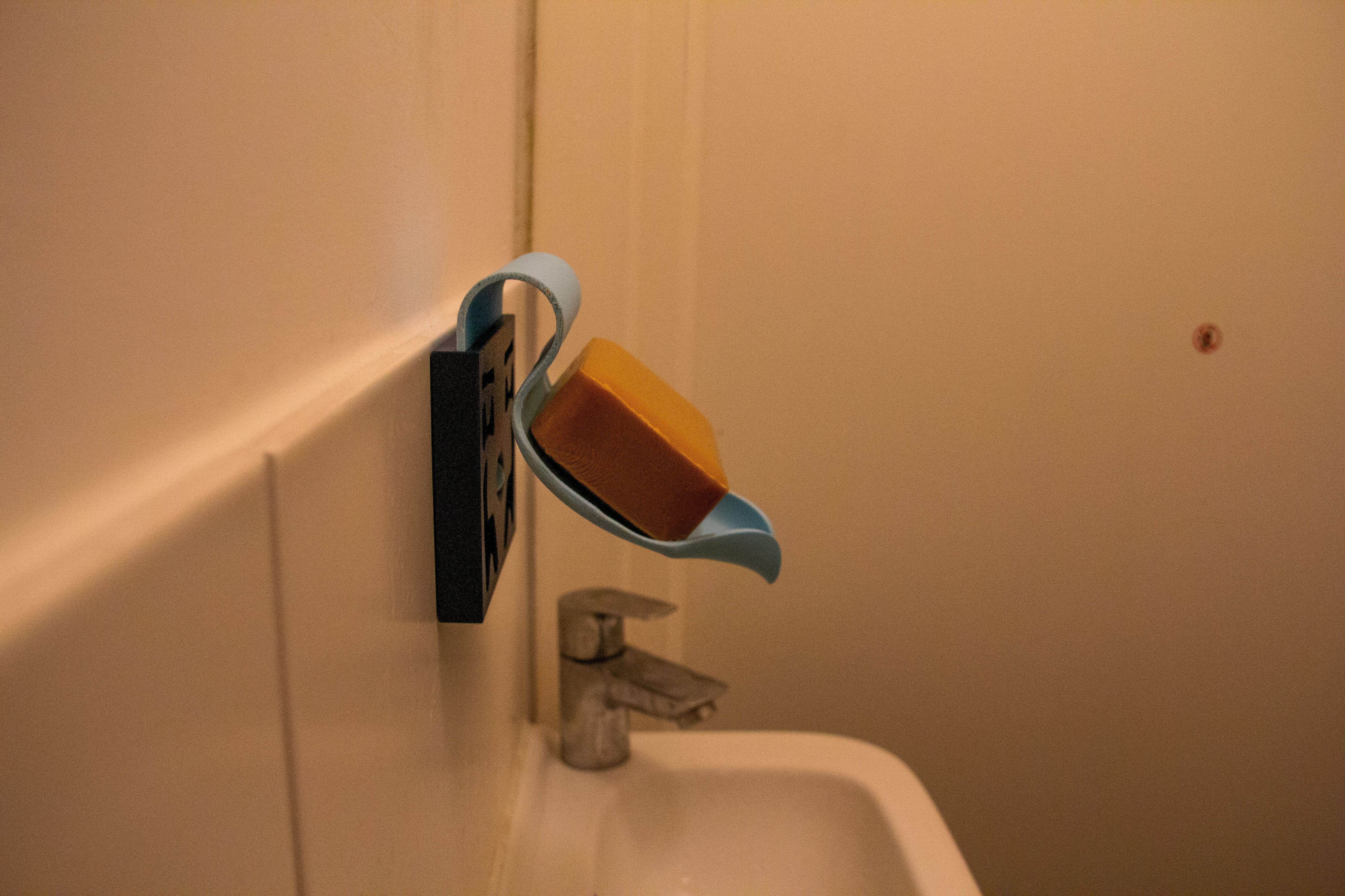 A wall-mounted soap bar holder engineered for easy cleaning, optimal drainage, and improved handling of slippery soap bars. The design features an organic, surface-modelled geometry that directs water away from the soap, keeping it dry and hygienic between uses. It attaches to smooth surfaces using adhesive mirror tape, allowing for tool-free installation, secure attachment, and easy repositioning.