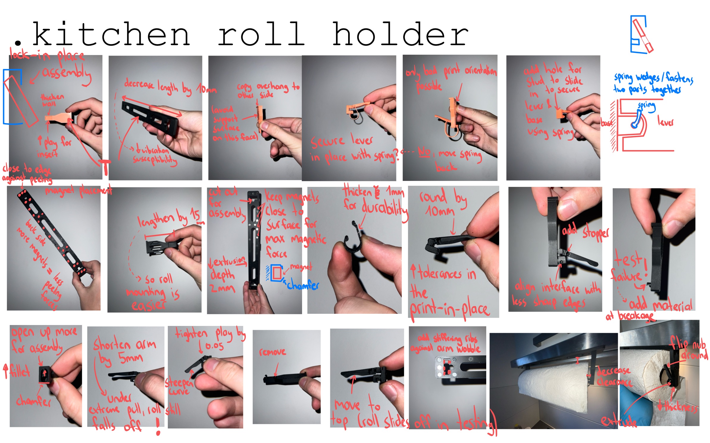 For the kitchen roll holder, the magnetic attachment is shown alongside the one-way spring hinge which allows paper rolls to be slid in from the bottom, yet the holder can firmly hold the paper roll´s weight during use.