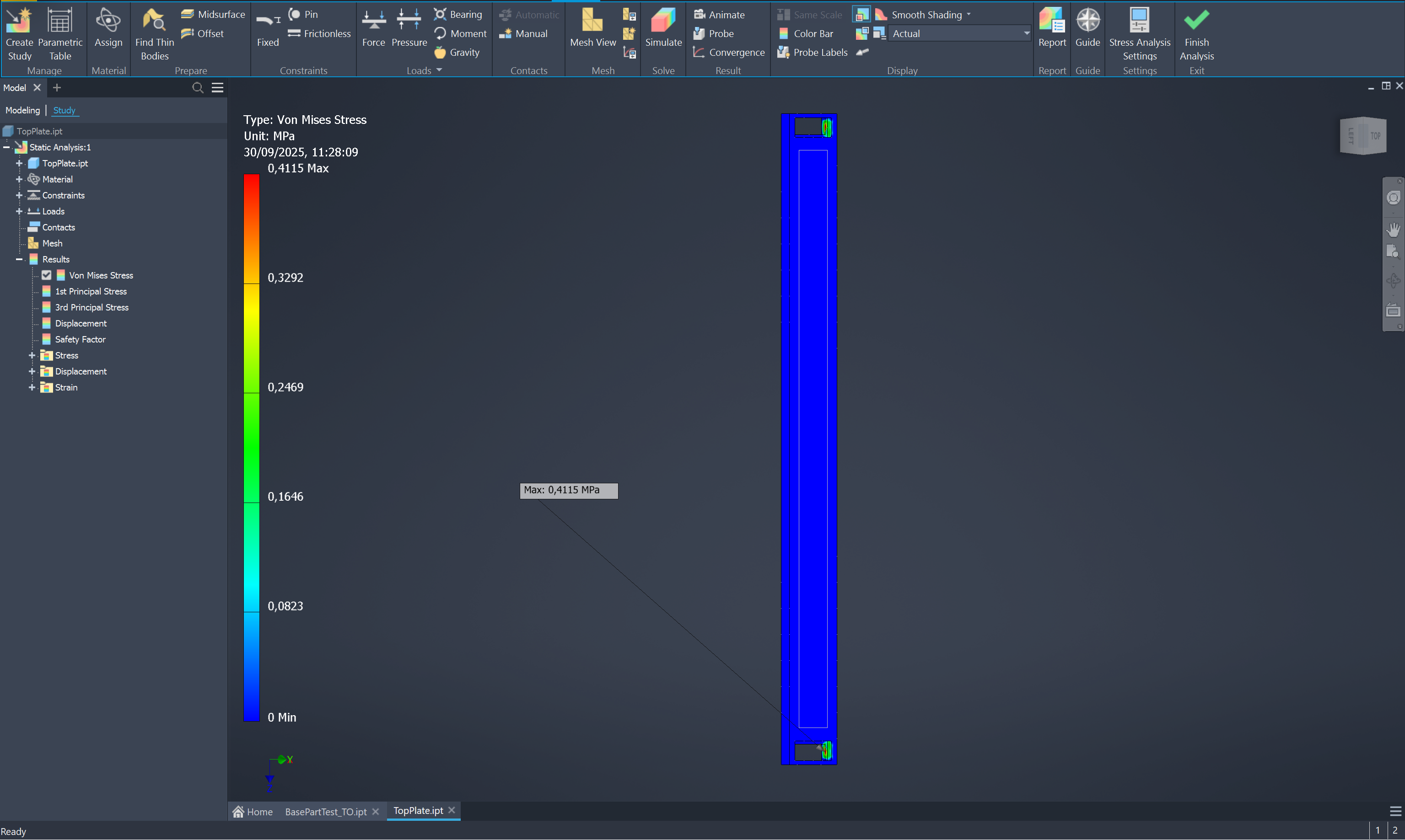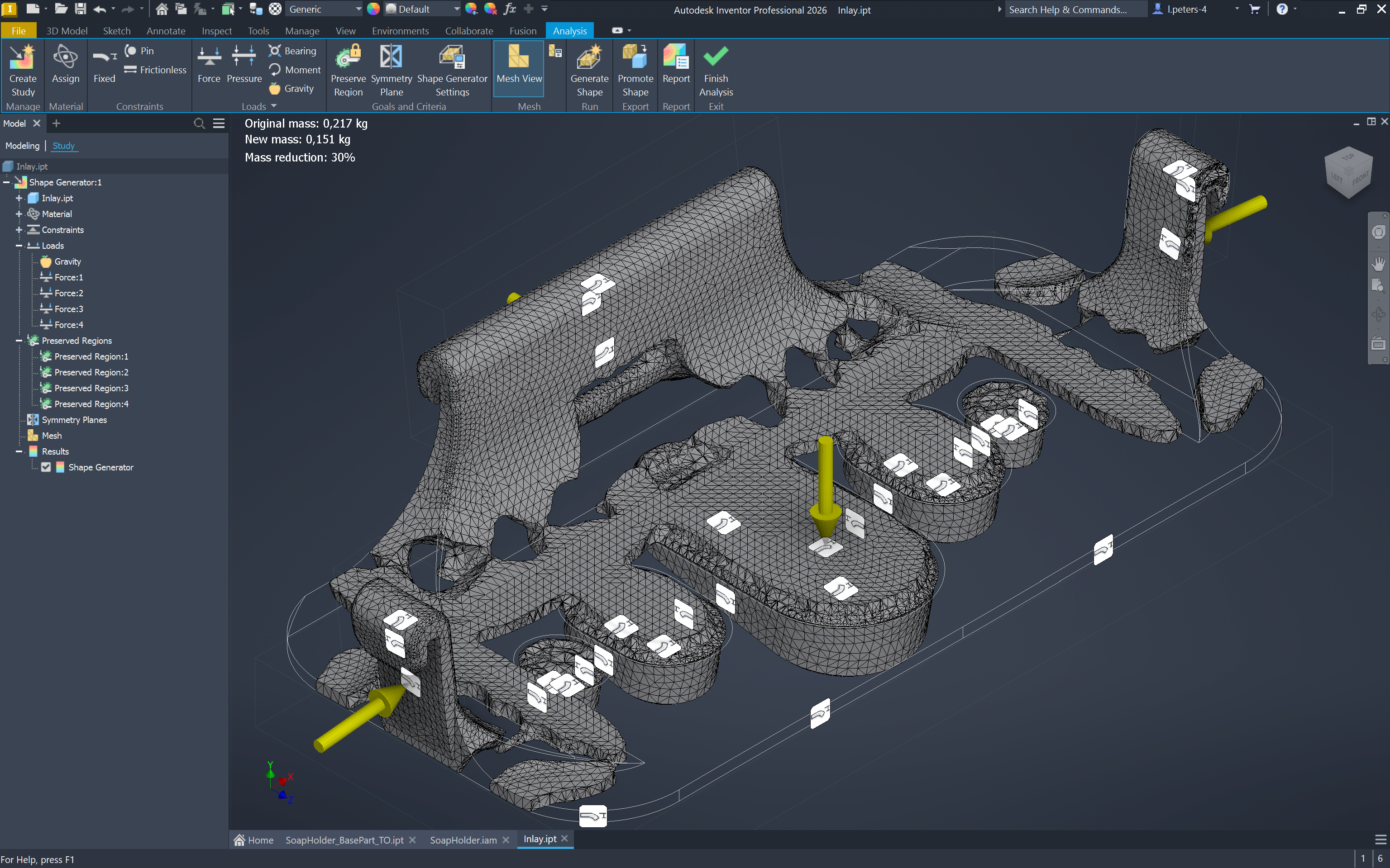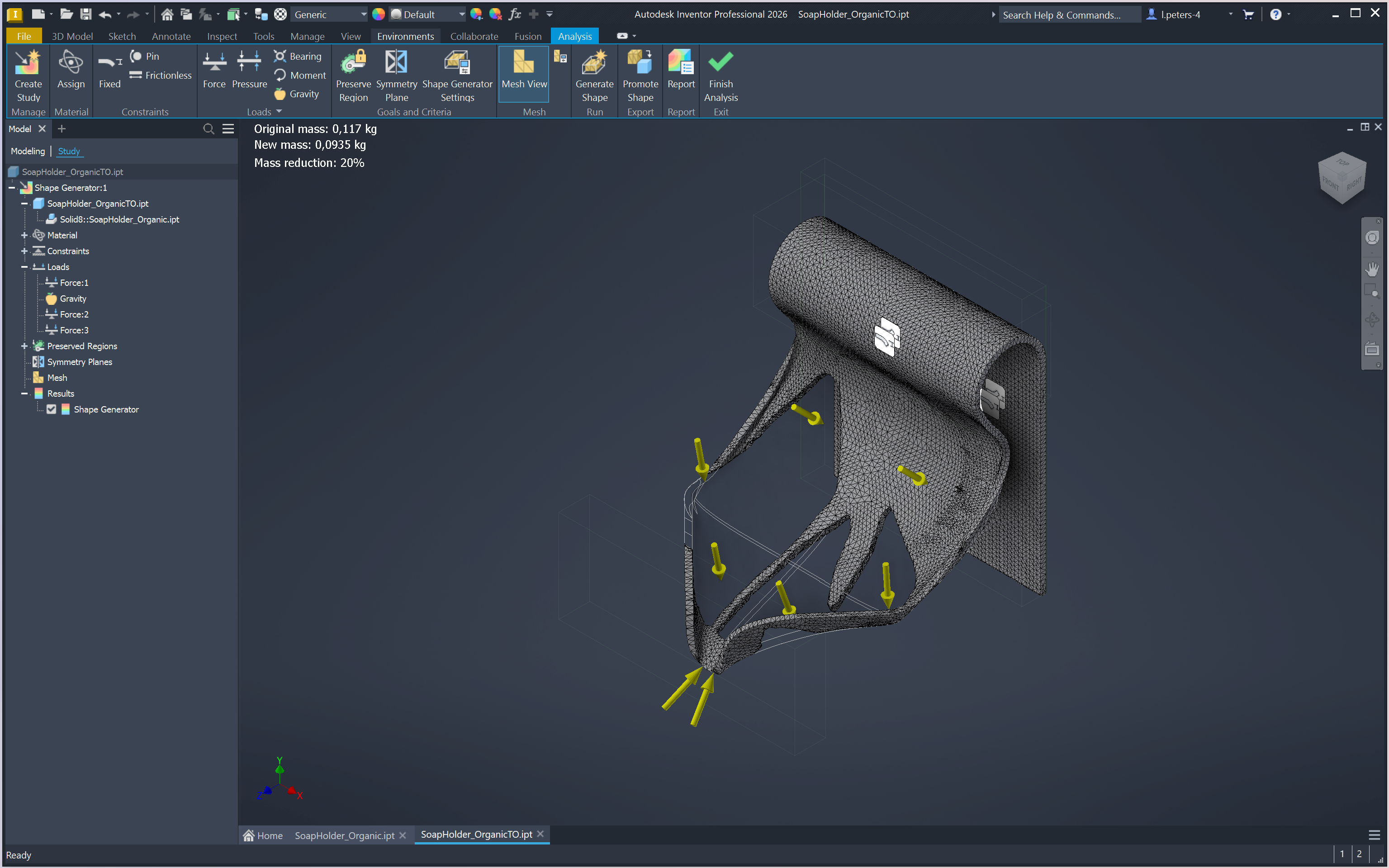 As seen below, the soap bar holder and kitchen roll holder were analyzed in Inventor, while the shelf divider and vase were simulated in SolidWorks (though visual results for these were unfortunately lost). These simulations served as the foundation for a topology optimization study, refining each product’s geometry to achieve optimal material distribution, reduced weight, and enhanced mechanical strength.